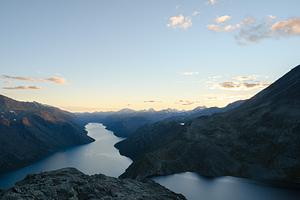 The steep Besseggen ridge separates a glacier-fed lake from a fjord thousands of feet below. Snow-capped mountains and a second alpine lake are visible in the distance.