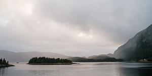 An island appears surrounded by fog and clouds, centered in a wide Norwegian Fjord.