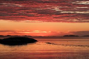 A bird is silhouetted in flight against a dramatic red sunset.