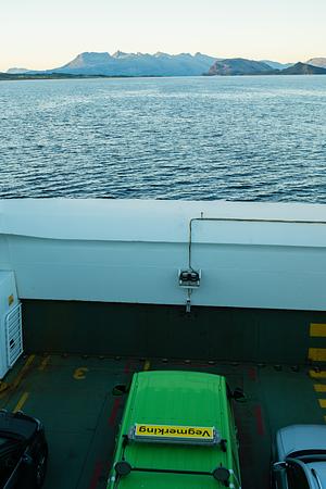 A ferry carries cars towards distant mountains in Northern Norway.