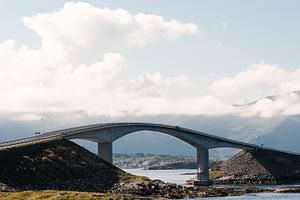 A steeply included bridge connects two sections of the Atlantic Road—a feat of Norwegian engineering stretching 8km of scattered archipelagos. Underneath we see a miniature lighthouse and settlements in the distant background.