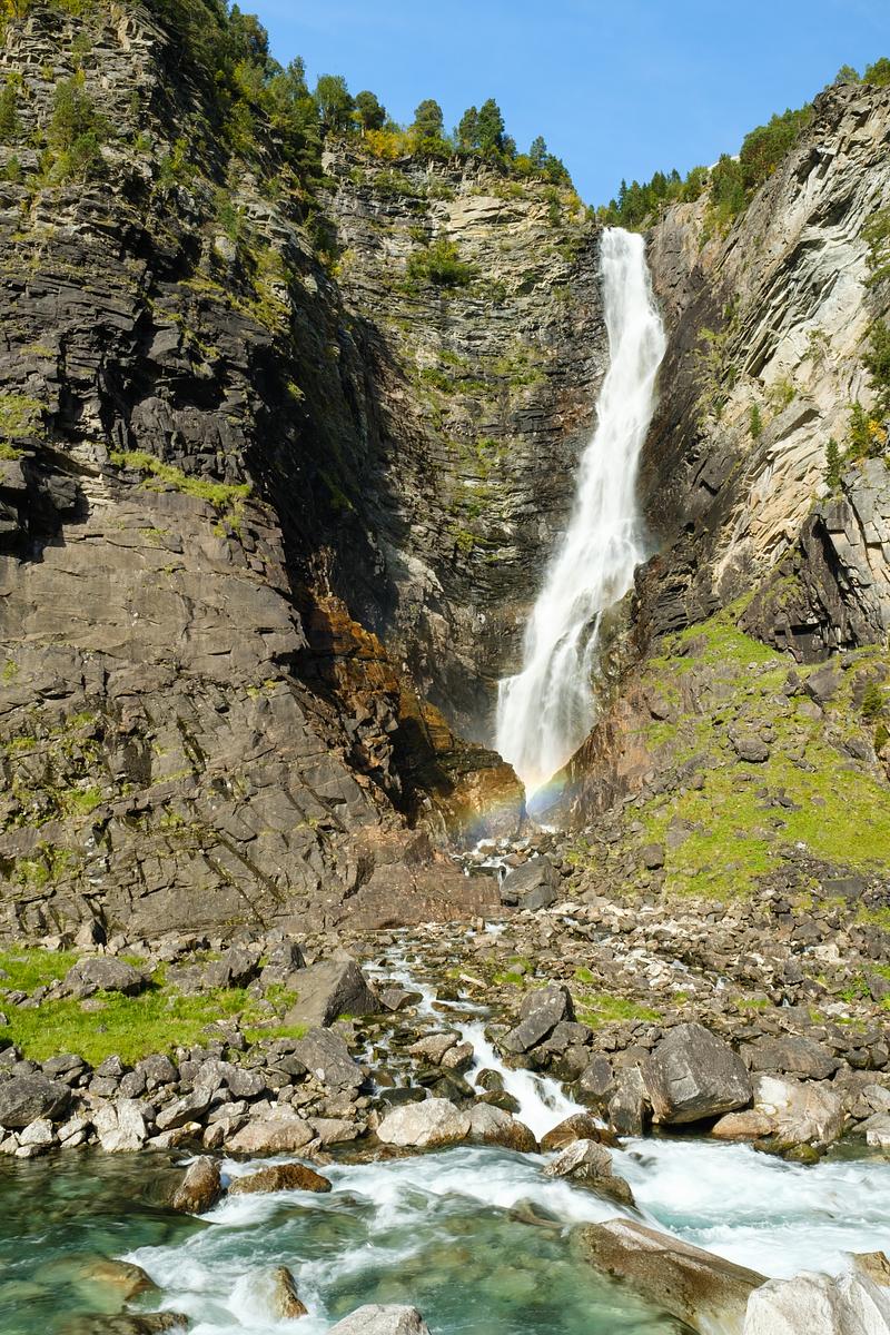 A tall waterfall causes a rainbow and creates an intersection as its runoff water joins with another stream.