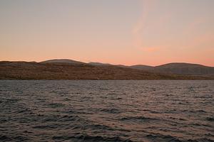 A deceivingly-large reservoir lays atop the Norwegian mountains. Houses and powerlines in the distant appear minuscule in comparison.