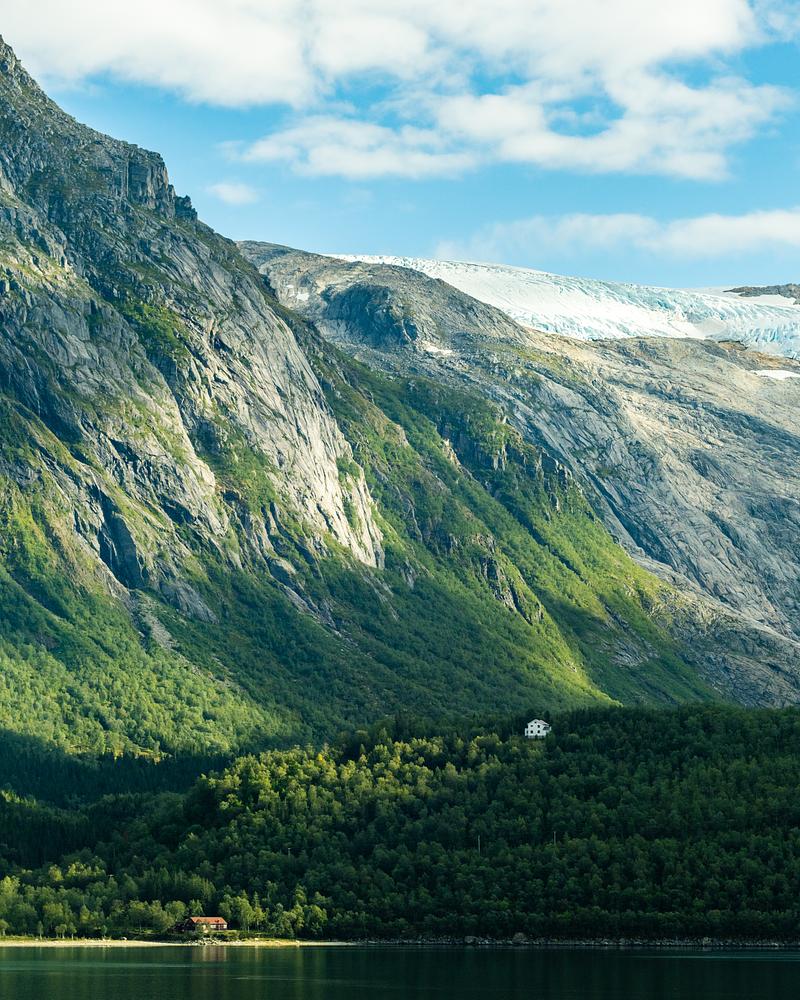 Two houses sit on the valley floor, minuscule in comparison to the large glacier-covered cliffs above.