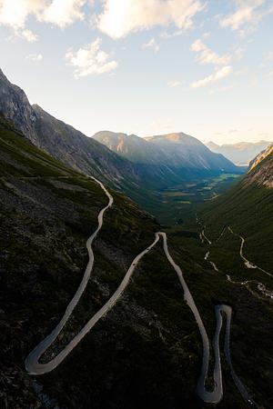 A zig-zagging road ascends the steep valley walls, with hazy sun-lit mountains extending into the distance.