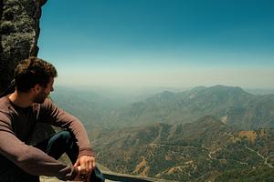 A resting hiker enjoys the view overlooking a windy mountain pass.
