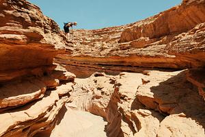 A climbing pole-weilding hiker peers over a ledge into the slot canyon.