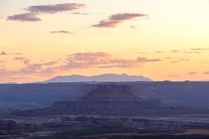 A setting sun illuminates mesas in the foreground, with distant mountains filling the background.